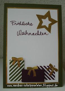 drei goldige Geschenke habe ich auf dieser Karte für euch platziert. Die Farbvorgabe von in(k)spire_me hat mir sehr gut gefallen und mir kam gleich die Idee mit den Geschenkpäckchen.